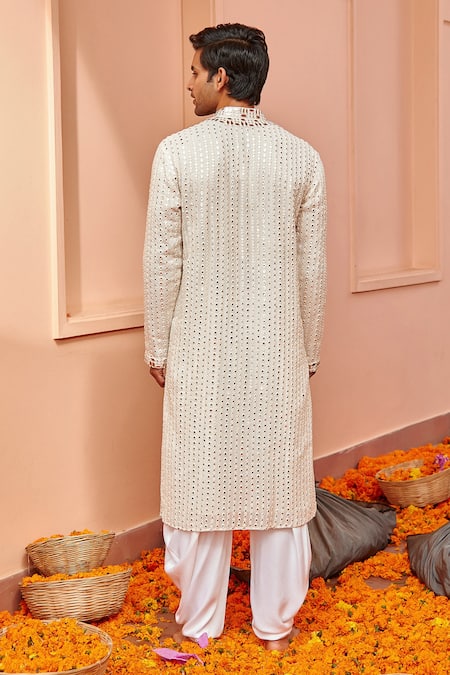 White kurta with mirror embroidery, front buttons & mandarin collar.