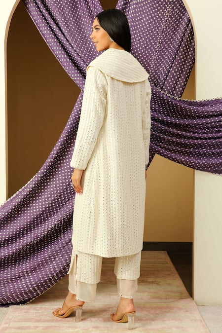 Off-white long jacket with mirror work embroidery in chevron motifs & cherry blossom motif embroidery on pockets.