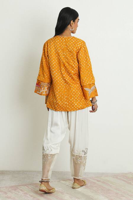 Off-white dhoti pant in modal satin base with sheer organza hem & floral motif hand embroidery.