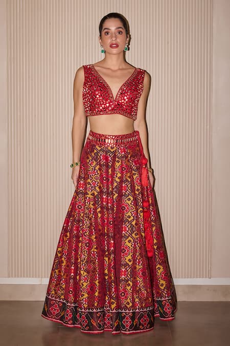 Red silk lehenga featuring intricate mirror hand embroidery and patola weaving. Paired with a coordinating embellished blouse and a contrast dupatta.