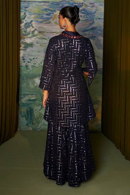 Navy blue mirror work sharara with tiered detail & asymmetric hem.