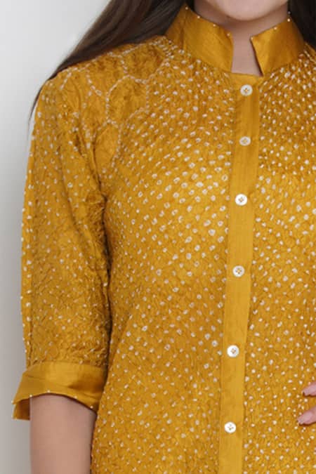 Yellow button down bandhani crushed tunic with printed motifs.