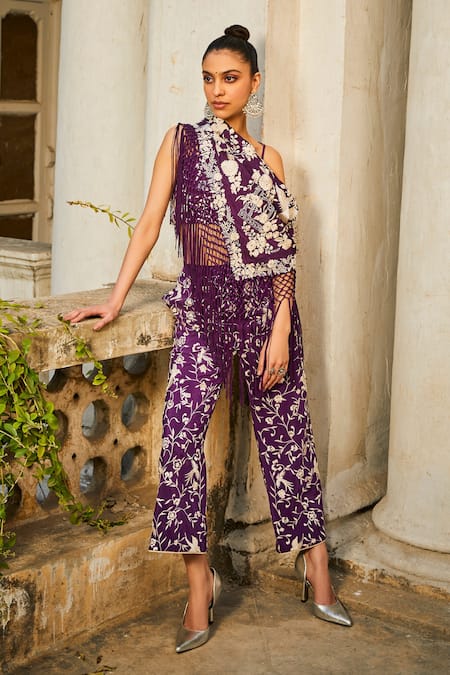 Buy_Twenty Nine_Purple Crepe Embroidery Thread Hand Bell-bottom Pant _Online_at_Aza_Fashions