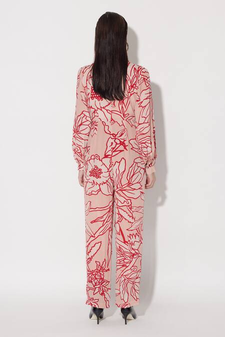 Rose Gold Crepe Printed Mangnolia Collared Eden Shirt With Pant