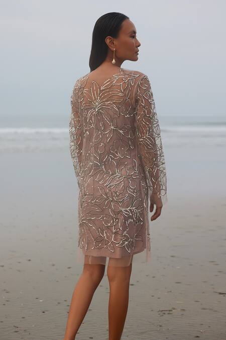 Pink dress featuring floral sequin and thread embroidery with a round neckline and full sleeves