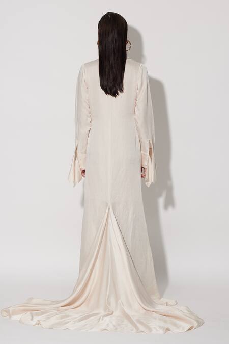 Ivory linen satin dress featuring a collar, draped cuff sleeve detailing, and a pleated high slit