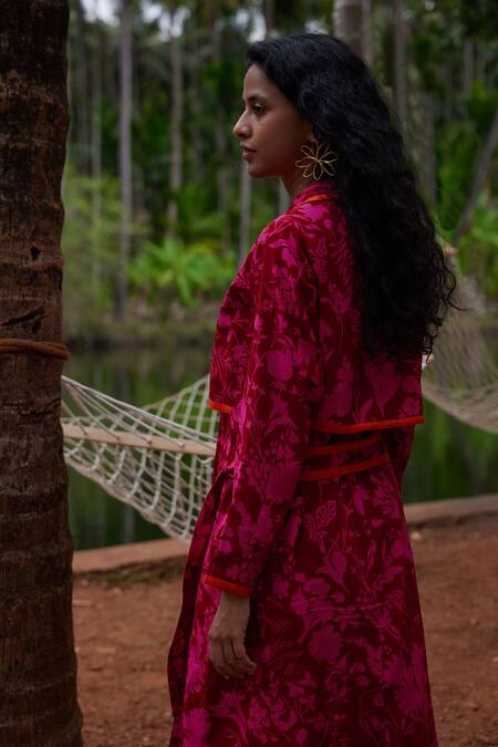 Fuchsia trench coat featuring a lapel collar and long sleeves with rainforest print