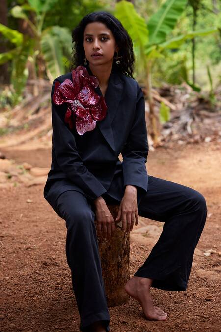 Black blazer featuring full sleeves and notched lapel collar with 3D flower placement embroidery. Paired with matching relaxed-fit pants, both made from linen satin fabric.