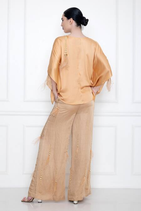 Gold kaftan drape top with pearl feather tassels.