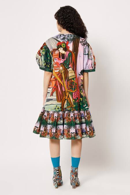 Purple A-line dress with samurai girl digital print & puffed sleeves detailing.