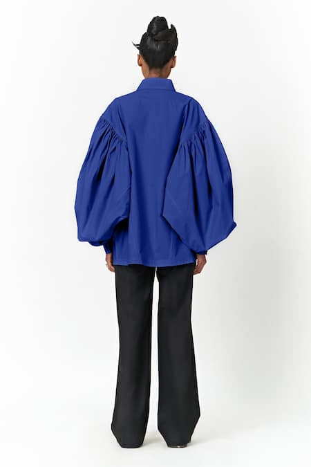 Electric blue cotton poplin wrap shirt with asymmetrical collar and strap detailing.