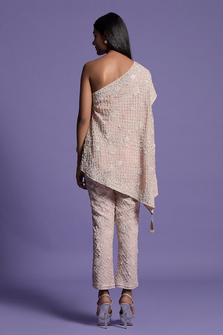 Blush pink one shoulder cape top with sequin, bead, pipe embroidery. Paired with pencil fit pant.