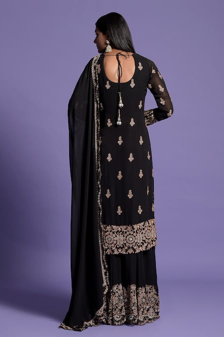 Black kurta with aari, zardozi, floral embroidery. Paired with sharara & dupatta.