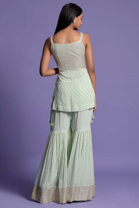 Pista green peplum top with sequin, resham embroidery. Paired with gharara & dupatta.