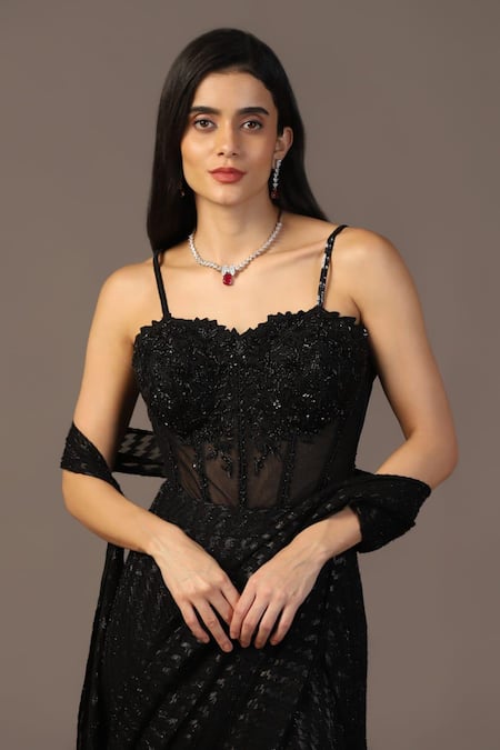 Black Net Sequins, Cut Work, Embroidered Pre-draped Saree With Corset Blouse