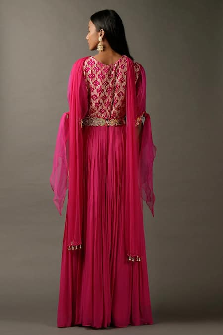 Hot pink anarkali with multi colored thread embroidered yoke. Comes with embroidered belt & choker dupatta.