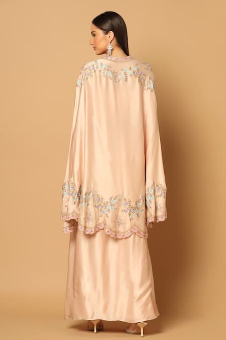 Peach Satin Embroidery Scoop Neck Floral Cape And Draped Skirt Set