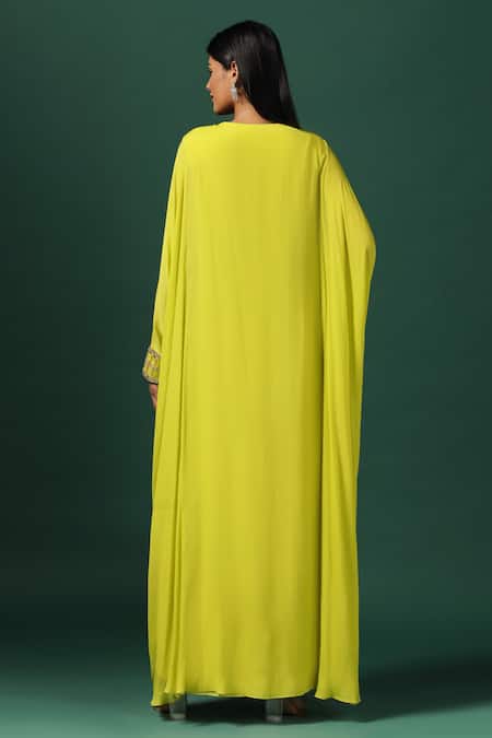 Green asymmetric kaftan featuring floral sequin, cutdana, and tasselled detailing. Paired with matching pant for a complete look.