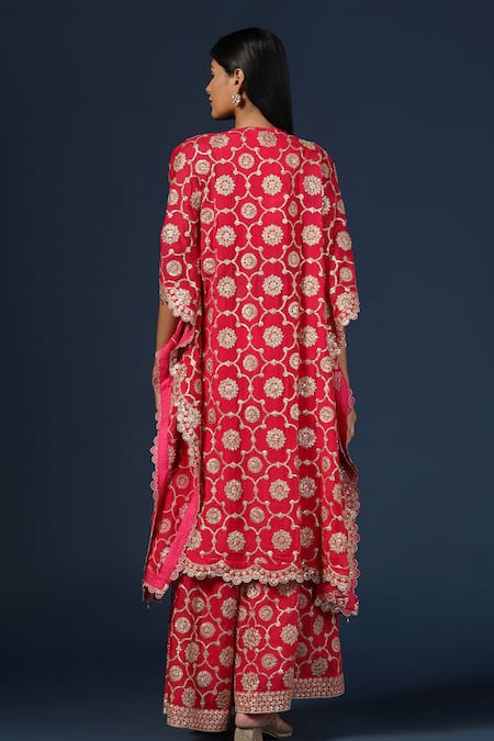 Fuchsia pink cape featuring sequin embroidered floral scallop motifs and scalloped borders. Paired with a sequin embroidered blouse and embroidered hem sharara.