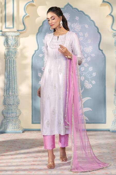 English lavender kurta featuring zardozi work floral motifs and striped tissue sleeve hem. Paired with a contrasting dark purple organza dupatta and matching silk pant.