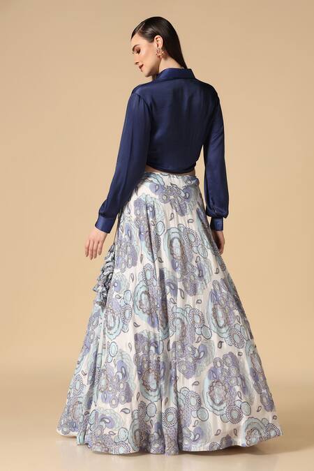Blue floral blossom printed lehenga skirt with zari embellishments. Paired with a plain shirt featuring a shirt collar and cuff sleeves.