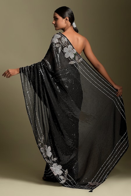 Black sequin embellished sheeting saree, elevated with gloss finish black sequins and contemporary flowers in swarovski crystals on the border & pallu.
