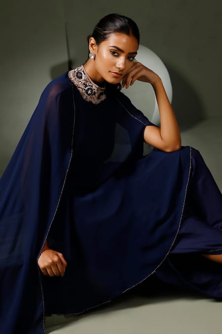 Navy blue cape style kurta featuring high neck with sequins, zari, stones & cutbeads embroidery. Paired with tulip pant and an inner.