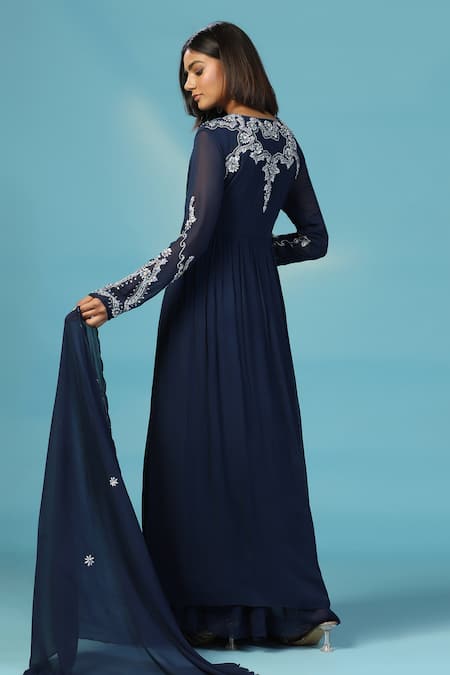 Navy blue Anarkali featuring intricate embroidery and full sleeves. Includes a matching sharara and dupatta.
