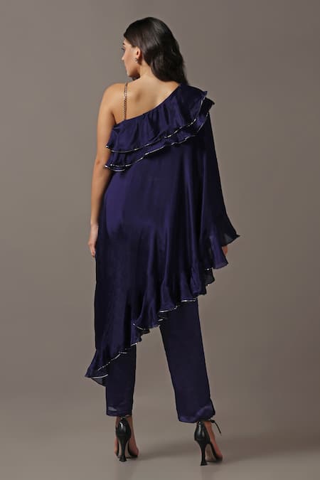 Blue one-shoulder asymmetric frilled top crafted from silk georgette. Paired with matching pants featuring a relaxed fit.