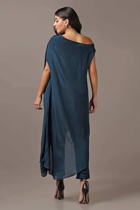 Teal blue off-shoulder kurta featuring asymmetric sleeves and embellished with cutdana and sequin work. Paired with a cigarette pant for a complete look.