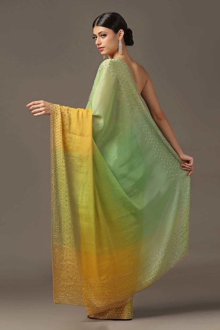 Light green and yellow ombre saree featuring cutdana embroidery in a geometric pattern along the border. Comes with an unstitched blouse piece for customization.