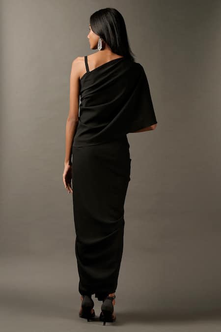 Black Viscose Floral Motif Asymmetric Neck One Shoulder Gown