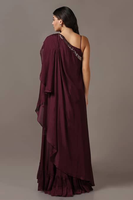 Buy_Two Sisters By Gyans_Wine Chiffon Sequins One Shoulder Embroidered Gown _at_Aza_Fashions