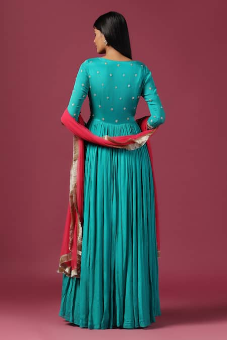Teal blue pleated anarkali featuring gold sequin, zari, and cutdana embroidery. Paired with a pink net dupatta with lace borders.