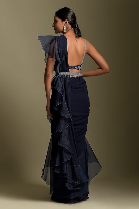 Blue ruffle pre-draped saree, with pleat detailing. Paired with tonal sequin & beads embellished blouse & beads embellished belt.