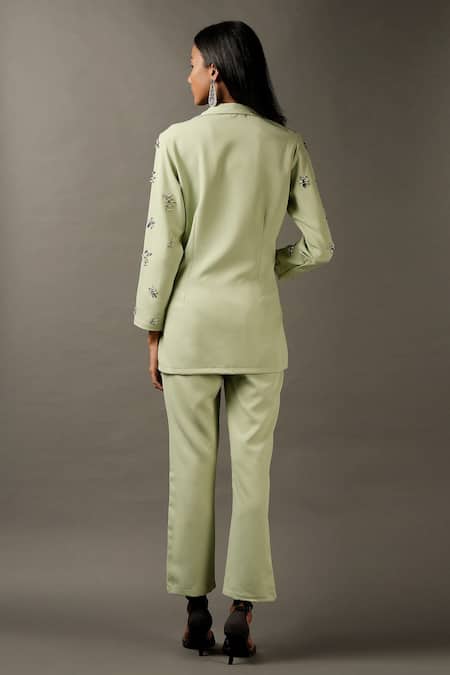 Green Viscose Rhinestones Lapel Collar Embellished Jacket And Pant Set