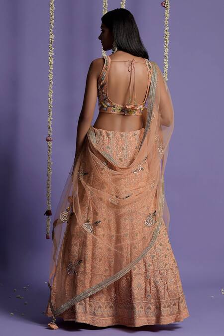 Dusky peach lehenga with zardozi, sequin, resham embroidery. Paired with embellished crop top & net dupatta.