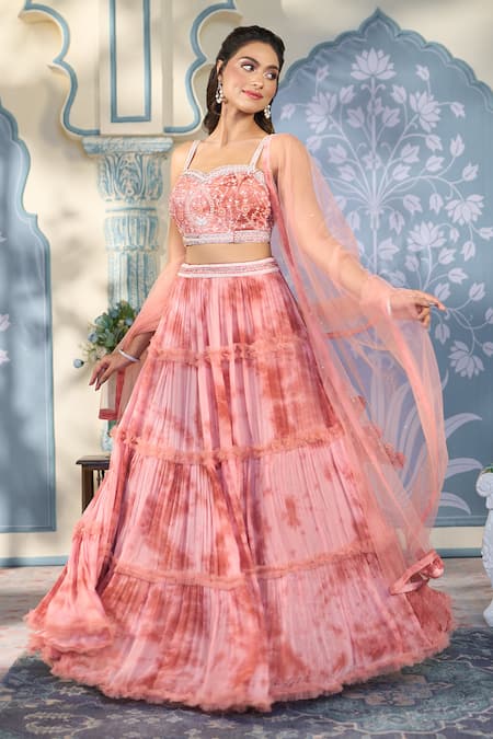 Orange Georgette Sequins, Pearls, Crystals, Tie Dye Pattern Lehenga Blouse Set