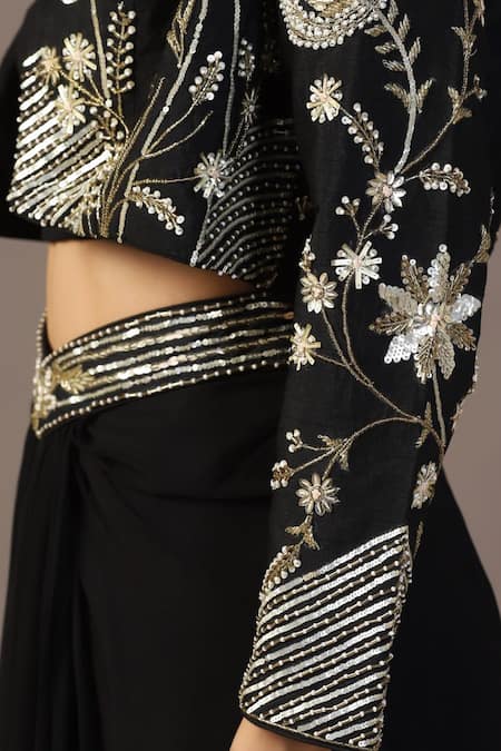 Black tropical embroidered jacket featuring sequin, cutdana, and moti work. Paired with a matching crop top and draped skirt with an embroidered waistband.