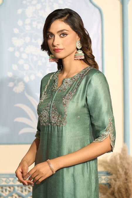 Green satin kurta featuring zardozi floral embroidery and a notched neckline. Paired with a deep green organza dupatta and matching pant.
