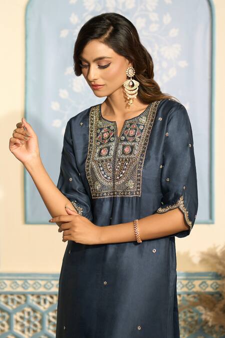 Royal blue satin kurta featuring floral embroidery with dabka, French knots, resham, and zari work. Paired with narrow dupion silk pant and soft net dupatta with tiny buttis and golden lace border.