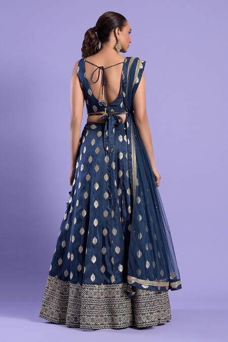 Navy blue kalidar lehenga with zari work border. Paired with V neck padded blouse sequin highlights & net embroidered border dupatta.
