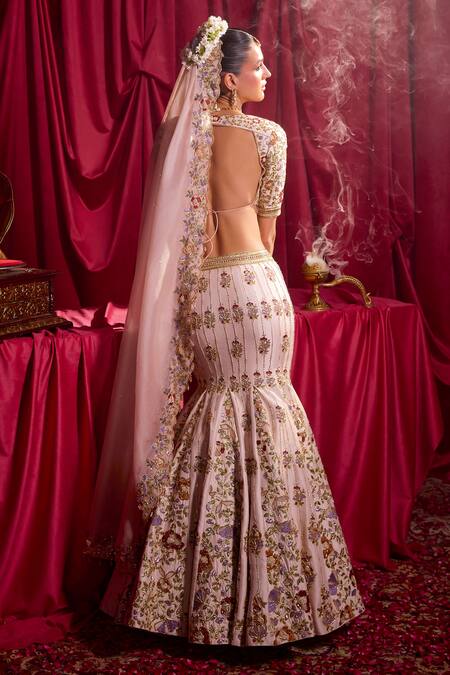 Powder pink fish cut lehenga with all-over floral embroidered buttis. Paired with a padded blouse featuring geometric and floral embroidery, along with a scallop trimmed embroidered dupatta.