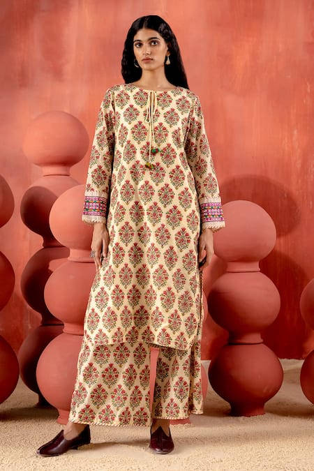 Beige cotton silk kurta featuring multi-colored buttas with block print and a tasseled tie-up. Paired with a pant and a silk organza dupatta adorned with handmade tassels.