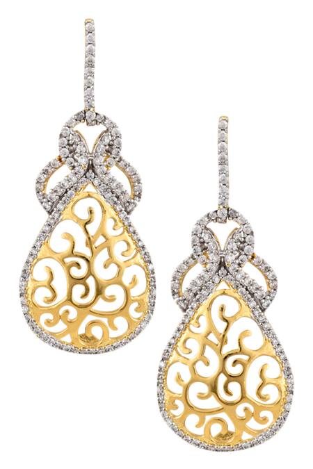 Gold toned drop earrings featuring intricate filigree cutwork and adorned with zirconia crystals