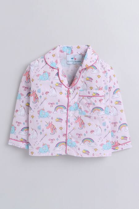 White and pink unicorn print button-down shirt featuring a notched collar and full sleeves. Paired with matching pants that have an elasticated waist and pocket detailing.