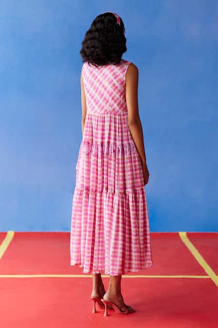 Pink gingham checkered midi dress featuring a V neckline and sleeveless design