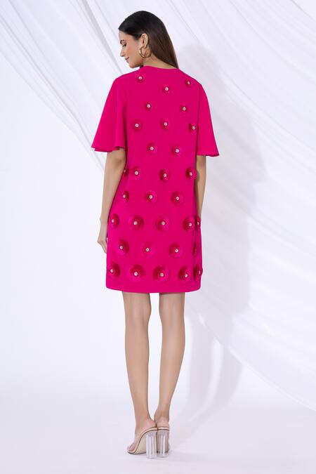 Pink shift dress with all over 3D floral applique & short flared sleeves.