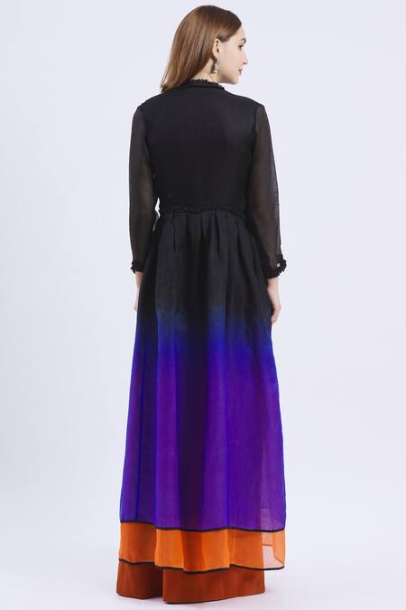 Black & blue front-open jacket with frayed sleeve hem & gathered detail.