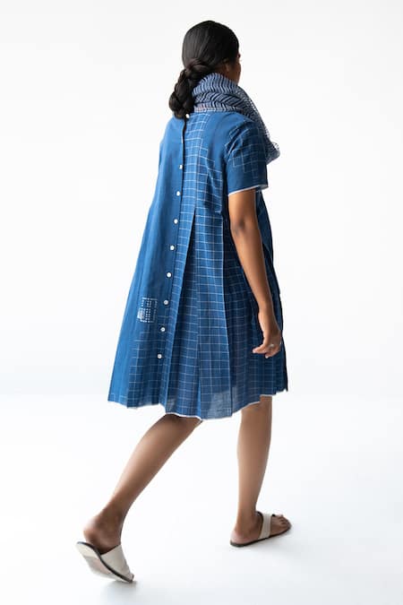 An indigo blue handwoven cotton dress featuring a round neckline, half sleeves, and a button placket at the back.